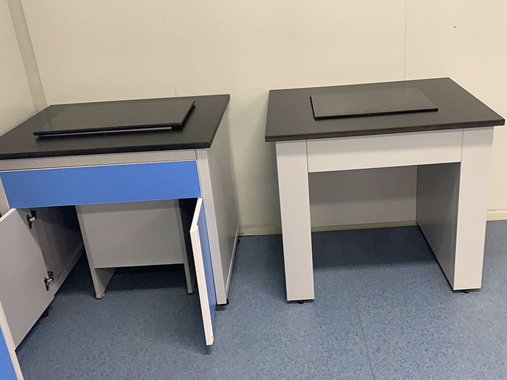 2、采用400 * 500 * 80mm黑色天然花崗巖臺面,嵌入酚醛樹脂復合臺面內,也可做整塊花崗巖臺面。 此臺面專門用于放置儀器天平。天然花崗巖石:臺面厚度≥60mm。